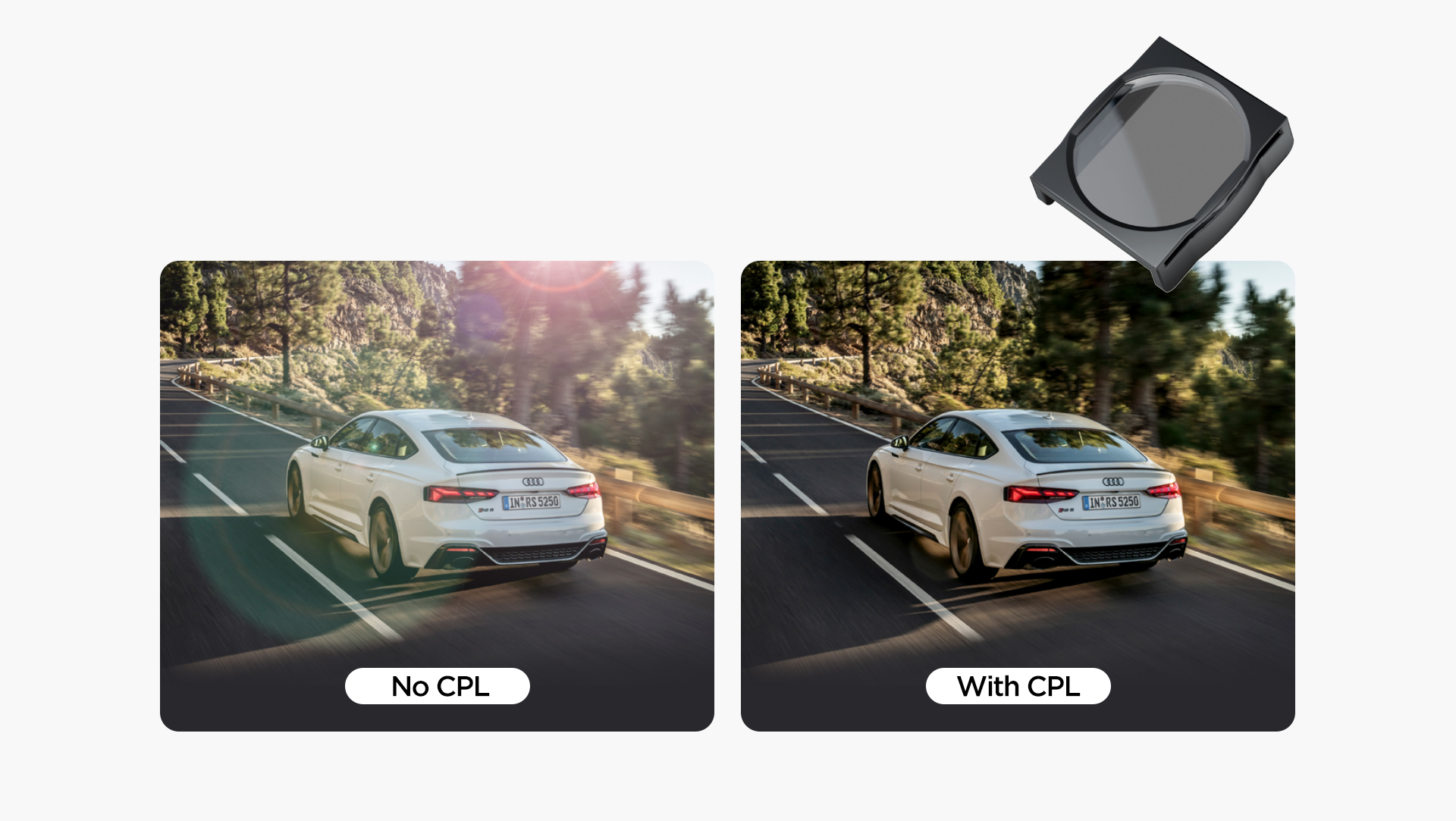 A CPL (Circular Polarizing Lens) filter can be used to reduce reflections and glare off glass and road surfaces, bringing significantly improved image clarity and contrast.