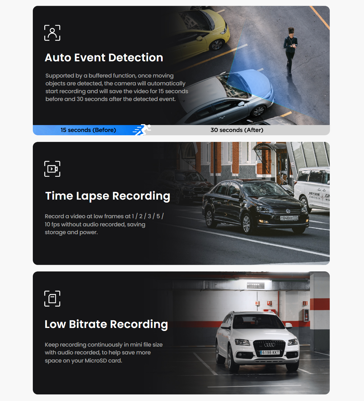 A119 Mini 2 supports seamless loop recording and overwrites the oldest videos with the last ones. With the built-in G-sensor, the dashcam will automatically lock the footage in case of collision or crash, recreating the accident scene for your peace of mind.