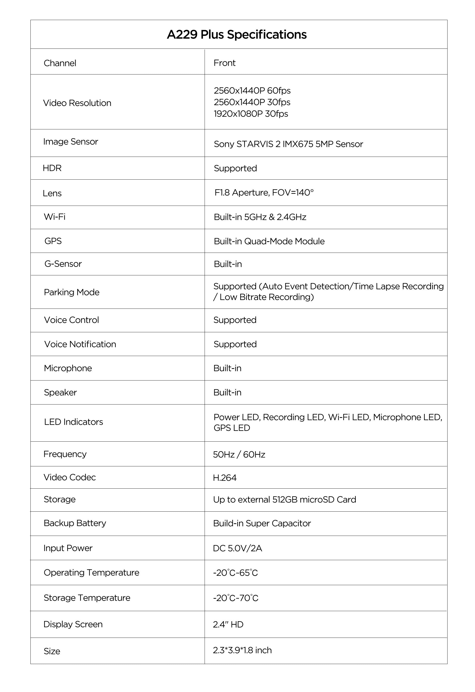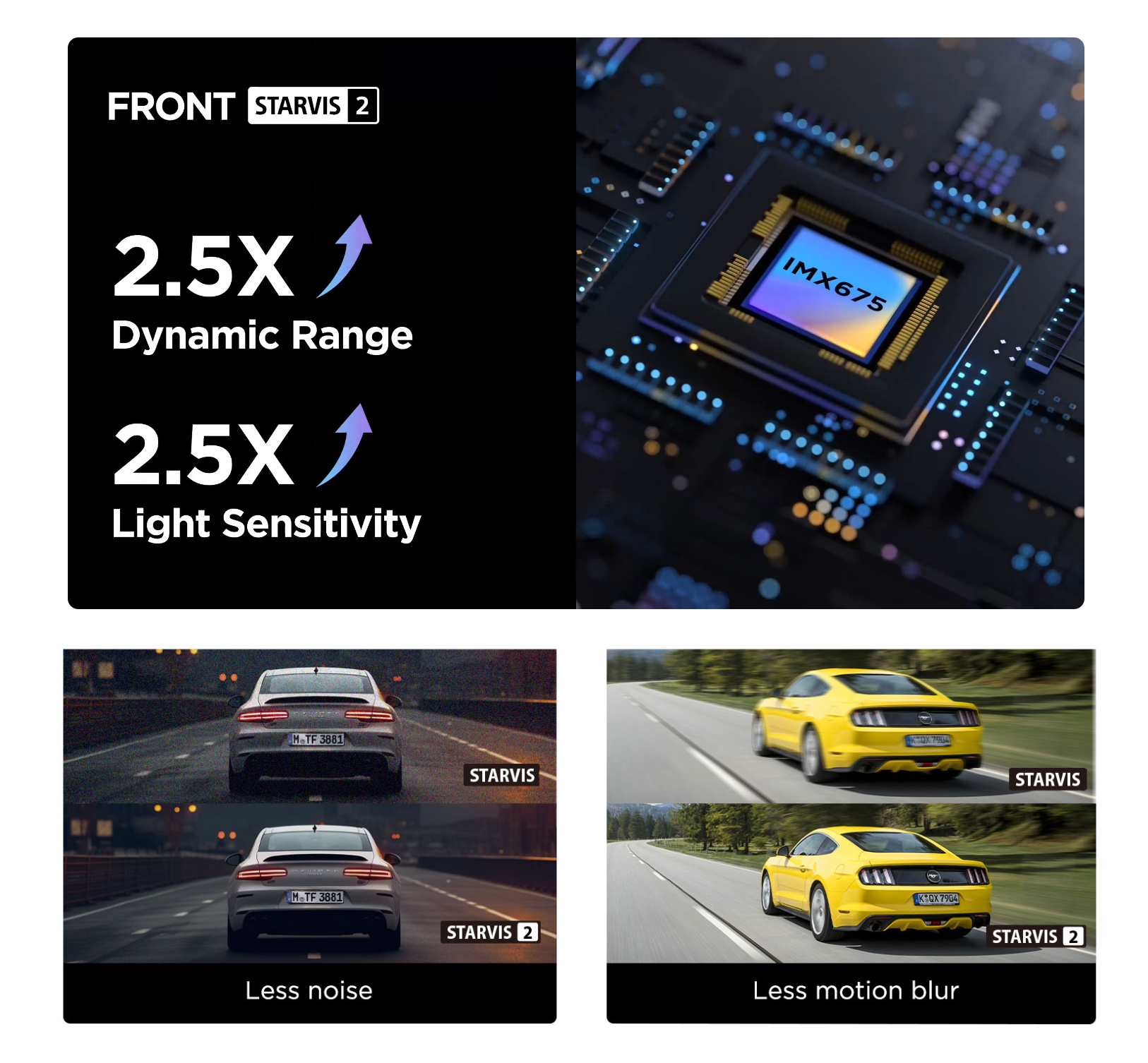 A229 Plus deploys cutting-edge Sony's latest STARVIS 2 technology, supporting upgraded 2K Quad HD recording for front view. It delivers excellent video quality, capturing every detail all day and night.