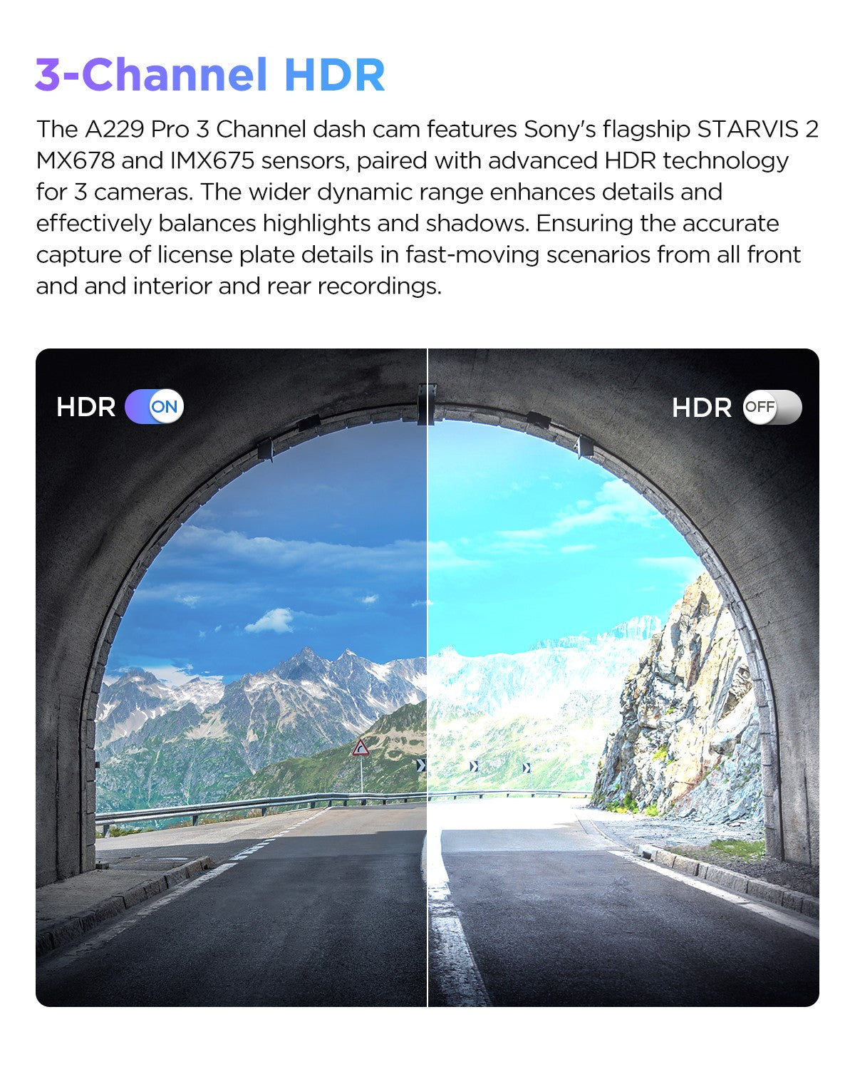 Equipped with cutting-edge three cameras that deploy Sony's latest STARVIS 2 technology, A229 Pro Tele delivers unmatched 4K&2K front