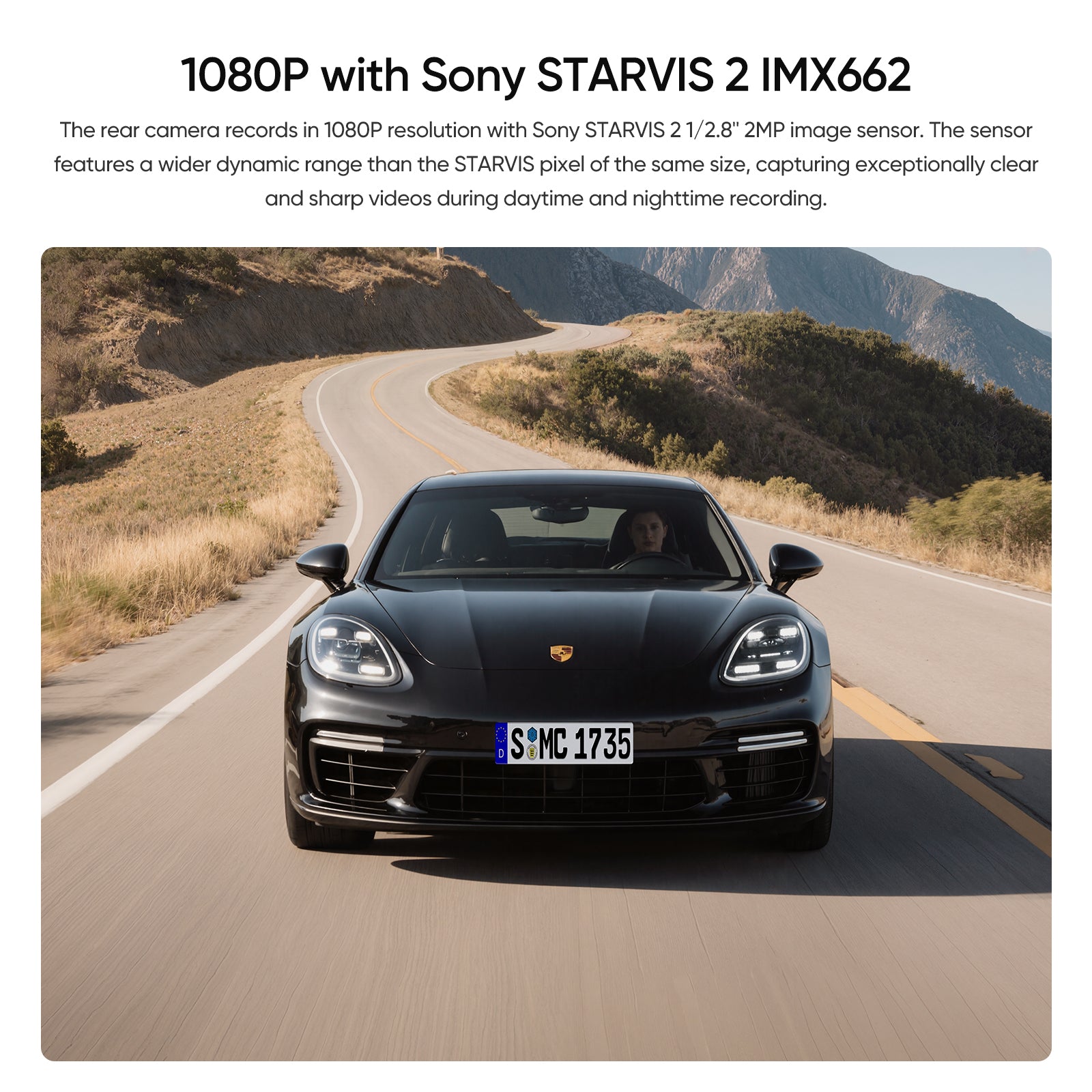 The rear camera records in 1080P resolution with Sony STARVIS 2 1/2.8'' 2MP image sensor. The sensor features a wider dynamic range than the STARVIS pixel of the same size, capturing exceptionally clear and sharp videos during daytime and nighttime recording.