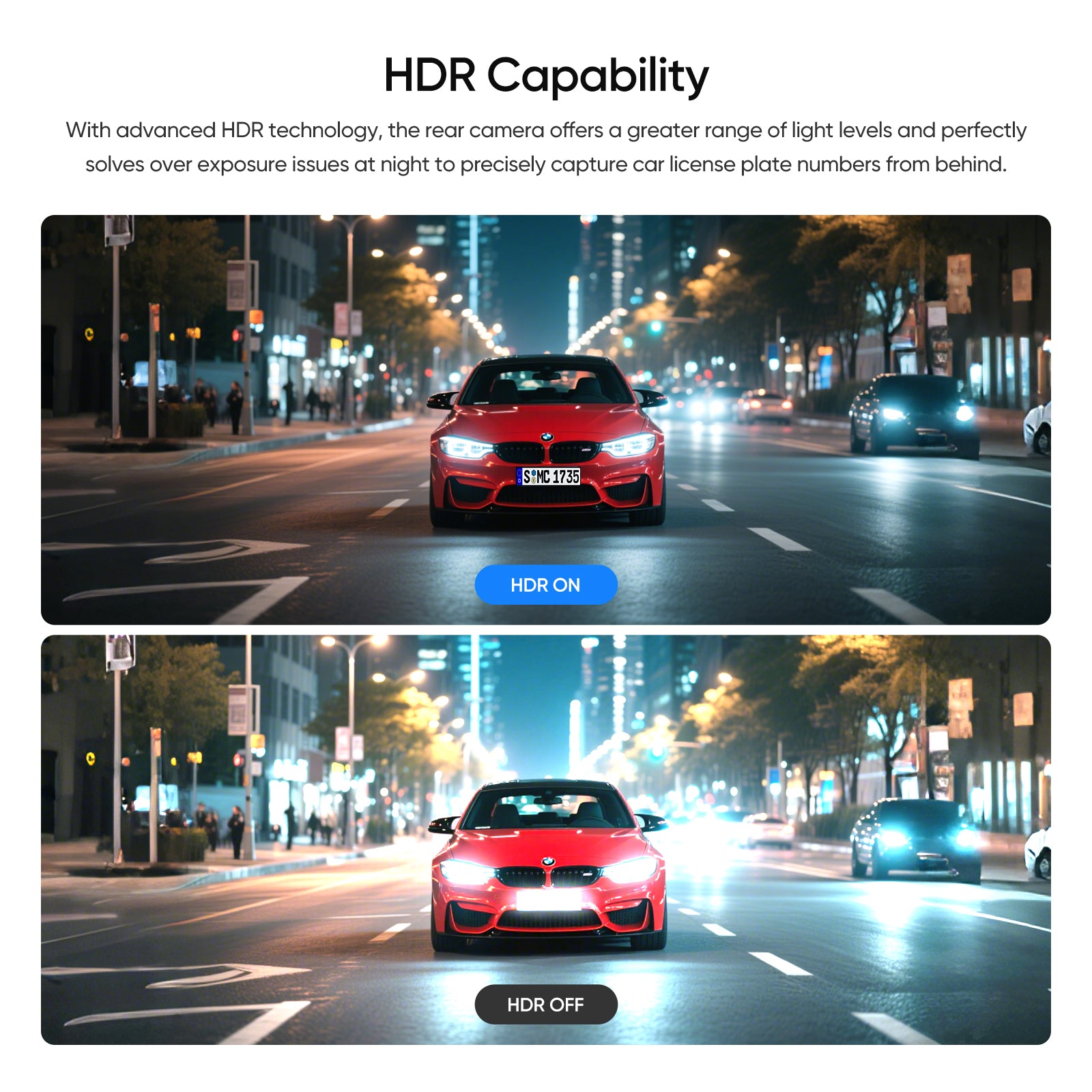 With advanced HDR technology, the rear camera offers a greater range of light levels and perfectly solves over exposure issues at night to precisely capture car license plate numbers from behind.