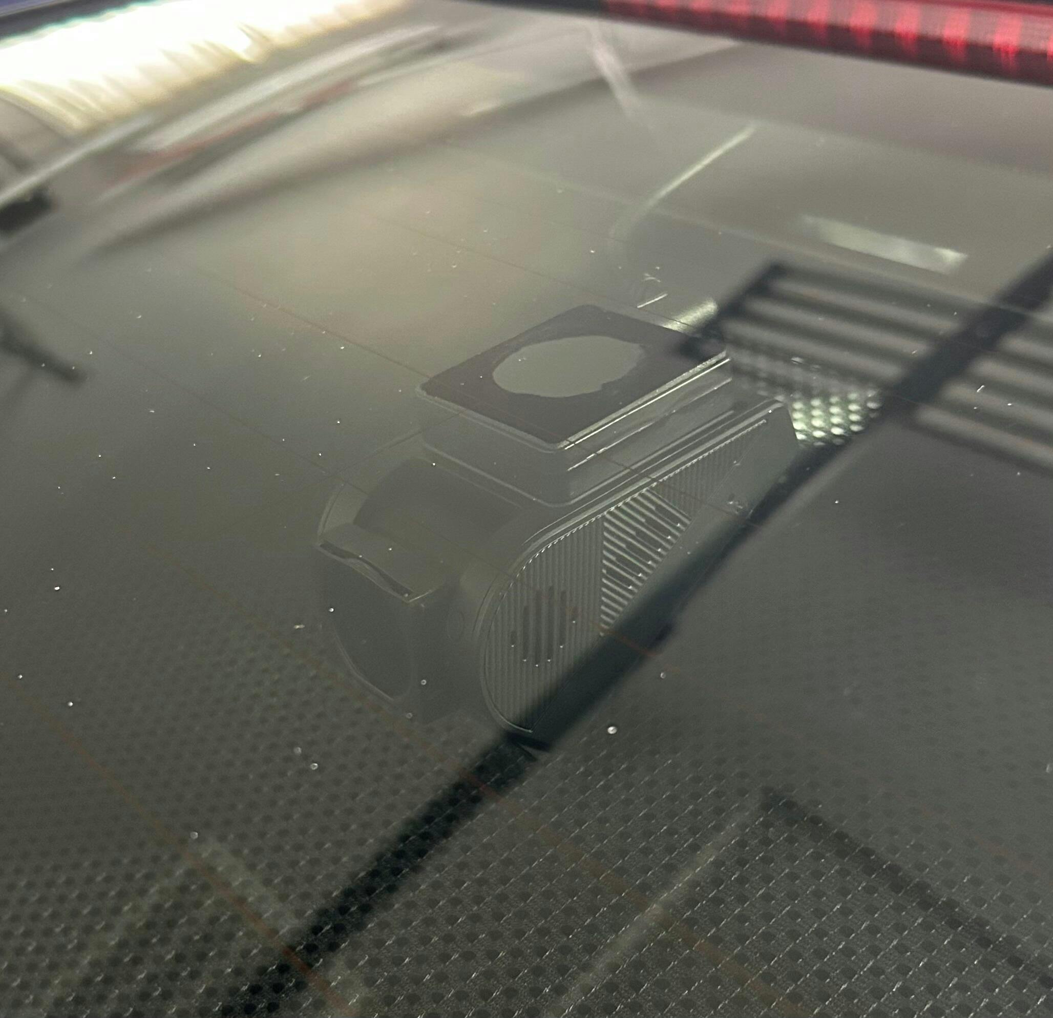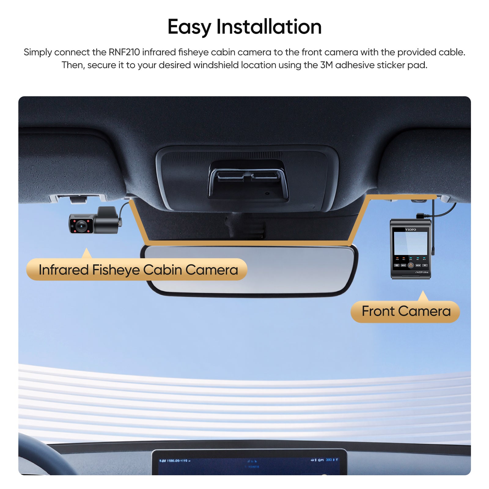 Simply connect the RNF210 infrared fisheye cabin camera to the front camera with the provided cable. Then, secure it to your desired windshield location using the 3M adhesive sticker pad.