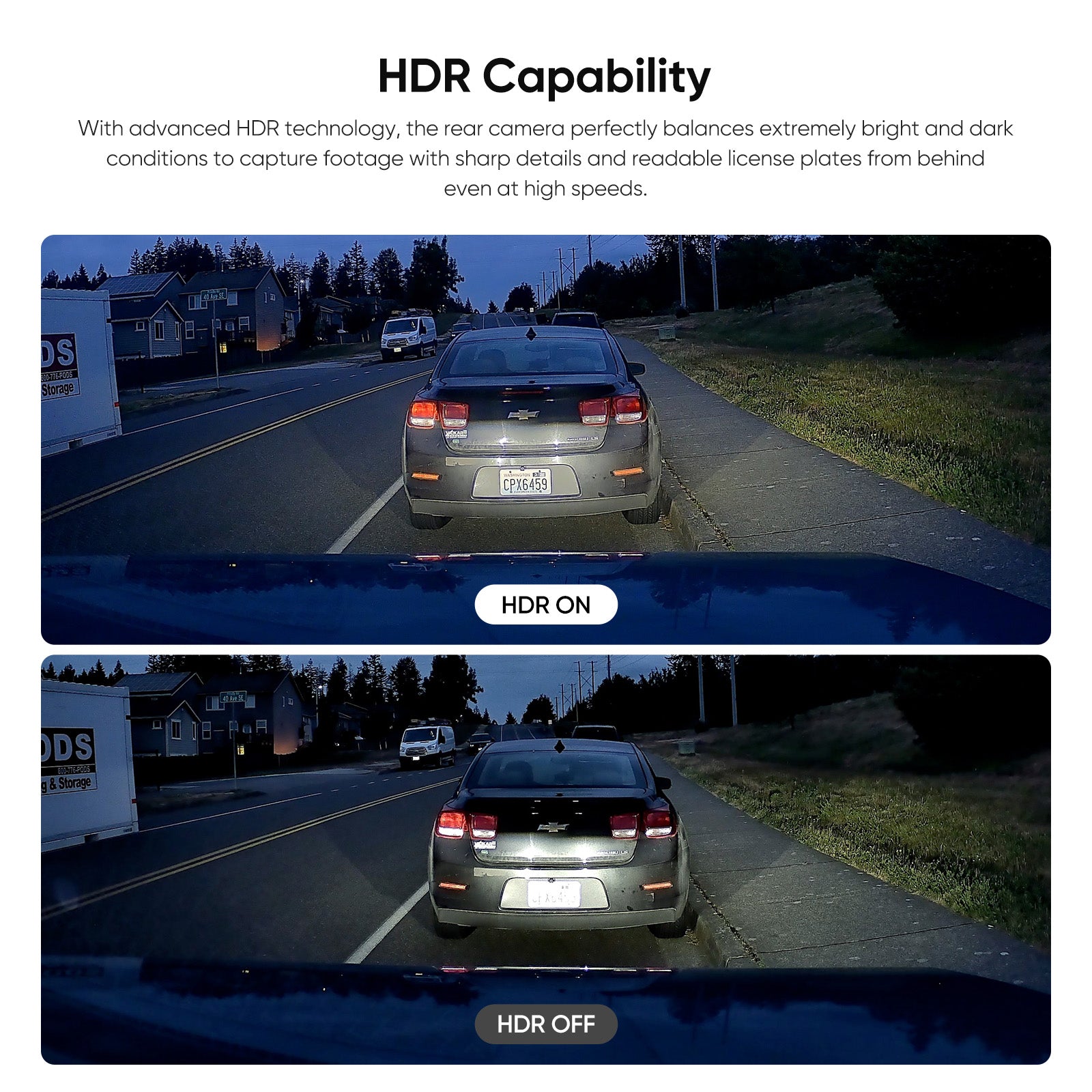 With advanced HDR technology, the rear camera perfectly balances extremely bright and dark conditions to capture footage with sharp details and readable license plates from behind even at high speeds.