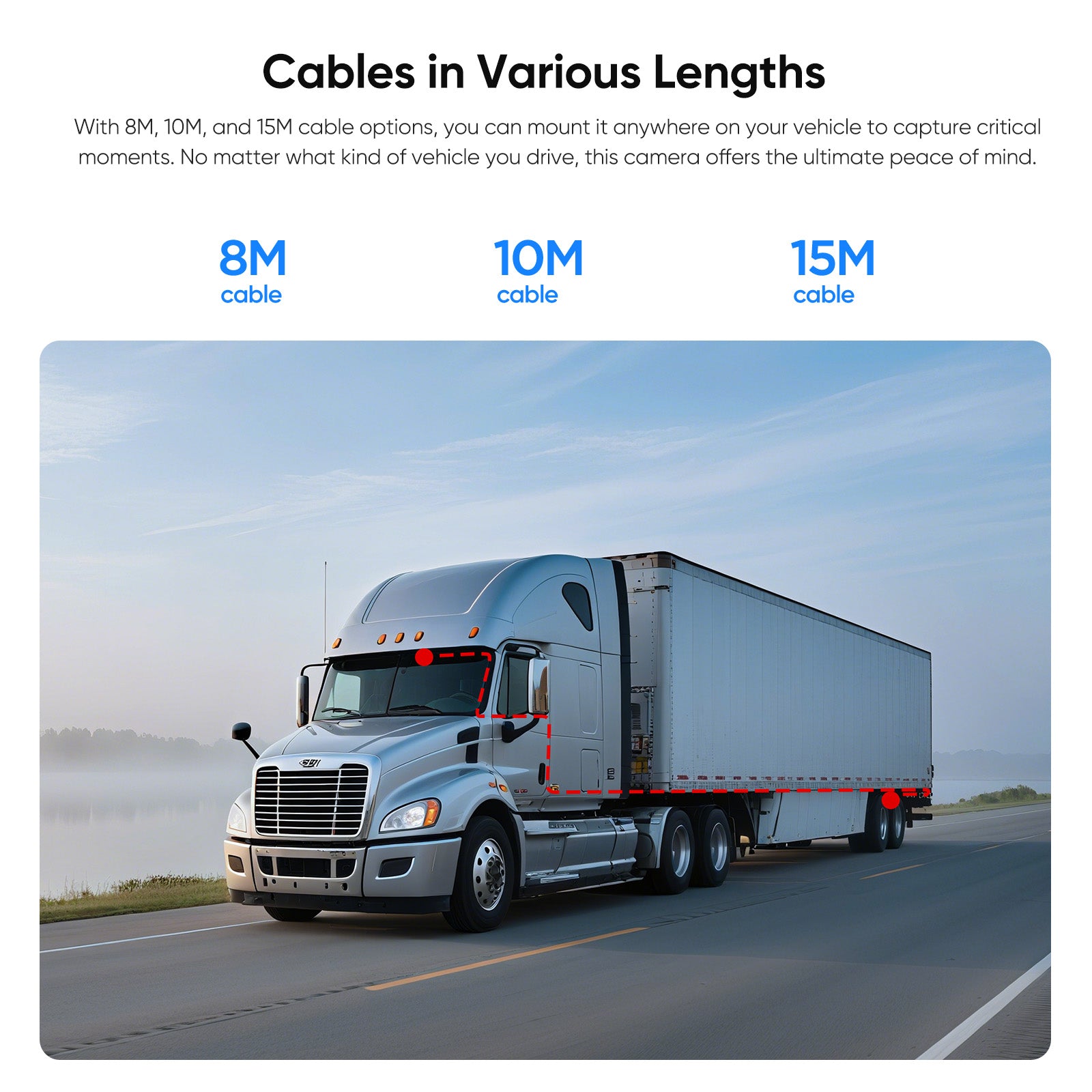 With 8M, 10M, and 15M cable options, you can mount it anywhere on your vehicle to capture critical moments. No matter what kind of vehicle you drive, this camera offers the ultimate peace of mind.